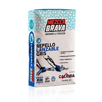 REPELLO LANZABLE GRIS Mezcla Brava es un producto en polvo, de color gris, elaborado a base de cemento portland, cal, arena de granulometría controlada y aditivos de alta calidad; que al agregarle agua, produce una pasta homogénea especialmente diseñada para repellar muros de forma manual o lanzado con máquina.